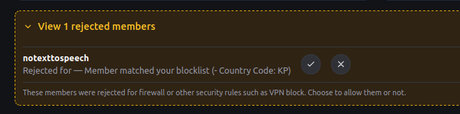 - No more losing members due to an accidental firewall rule or VPN detection!You can now manage rejected members and accept them or deny them (SEE HERE)